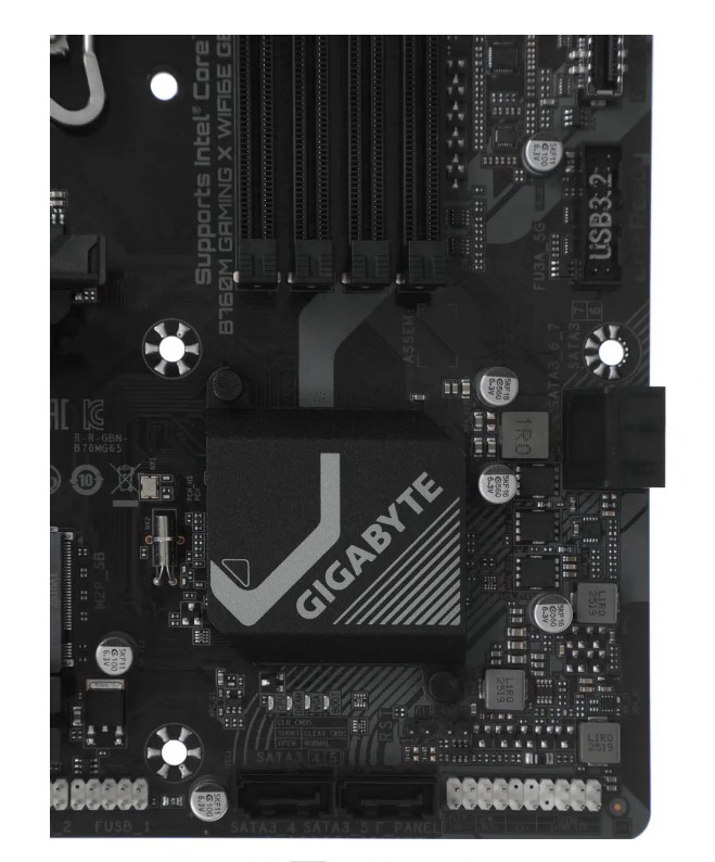 Подключение к сети Интернет осуществляется с помощью проводного контроллера Realtek 2.5 Гбит/с и беспроводного Intel Wi-Fi 6E AX210. С тыльной стороны предусмотрены порты USB Type-A, видеовыходы DisplayPort и HDMI, разъемы аудио. GIGABYTE B760M GAMING X WIFI6E GEN5 оснащена крупными охлаждающими элементами и надежными компонентами.