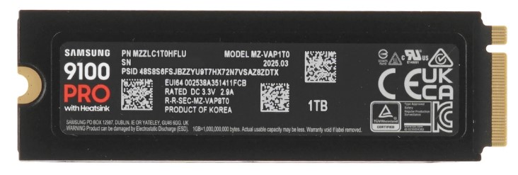 Дизайн Samsung 9100 PRO выполнен в строгом чёрном цвете, что делает его стильным дополнением любого системного блока. Встроенный радиатор не только улучшает охлаждение, но и придаёт накопителю современный и технологичный вид.