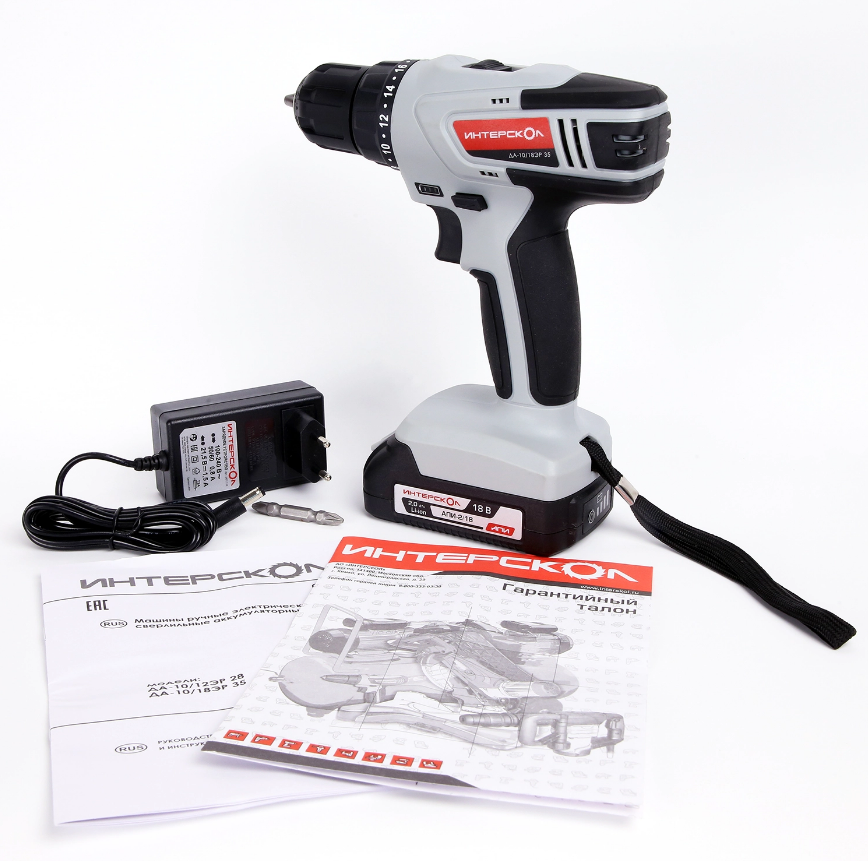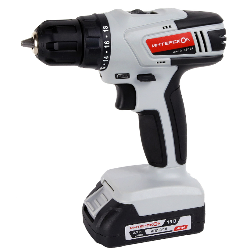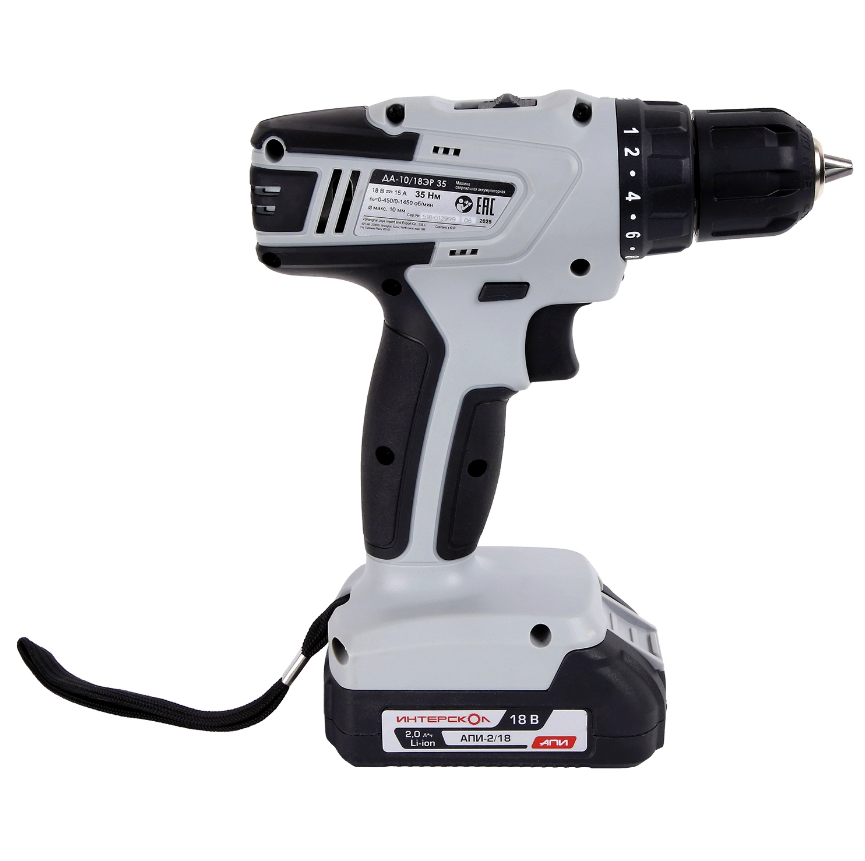 Аккумуляторная дрель-шуруповерт ИНТЕРСКОЛ ДА-10/18ЭР 35 ПРОМО, 18В, 1400 об/мин, с 1 АКБ 2 Ач и ЗУ