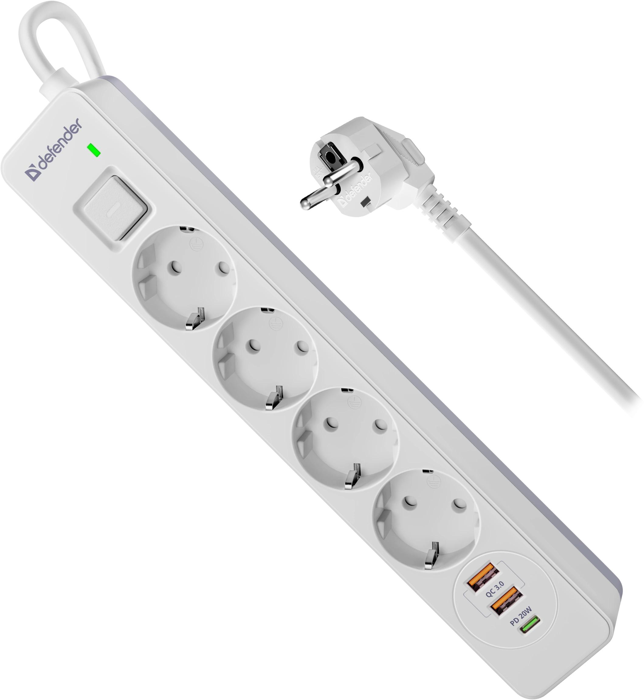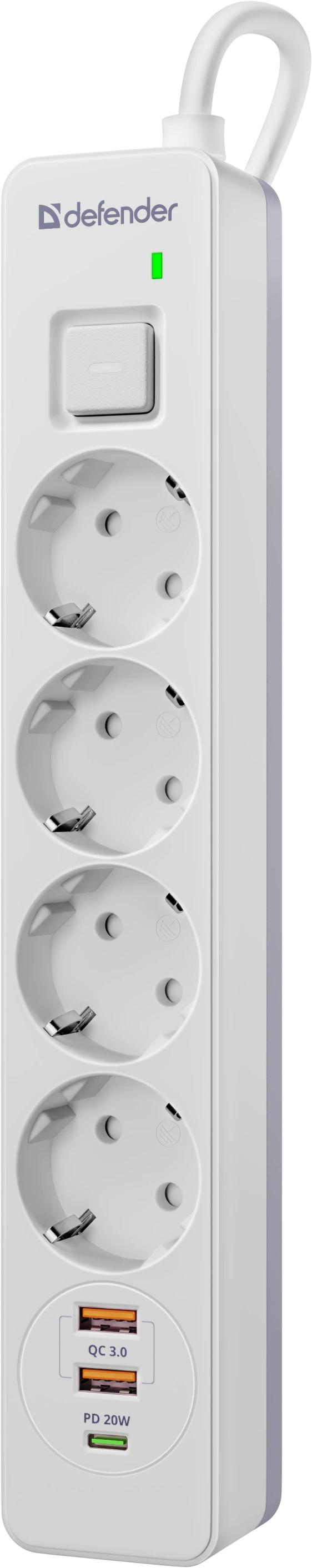 Сетевой фильтр 1.5м 3*1.5кв.мм 4розетки 16A 230В 2хUSB+Type-C белый DFS 141 99433 DEFENDER