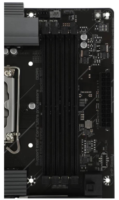 Плата построена на чипсете Intel B860, который даёт доступ к ключевым технологиям Intel: поддержке высокоскоростной памяти DDR5, интерфейсам PCI Express 5.0 и 4.0, а также множеству USB0портов разных поколений. Для оперативной памяти предусмотрены 4 слота DDR5 DIMM — они позволяют установить до 256 ГБ ОЗУ с частотами от базовых 4800 МГц (JEDEC0стандарт) до экстремальных 9066 МГц при активации профилей разгона XMP 3.0.