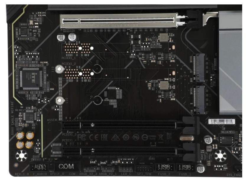 Система расширения включает один слот PCI E 5.0 016 для видеокарты и два слота PCI E 4.0 016, работающих в режиме 01, что удобно для подключения дополнительных контроллеров или плат расширения. Для накопителей доступны три разъёма M.2 (Key M) с поддержкой форматов 2260/ 2280/ 22110/ 25110 и четыре порта SATA 6 Гбит/с, что позволяет организовать гибкую и быструю систему хранения данных с использованием NVMe0SSD и классических HDD/SSD.