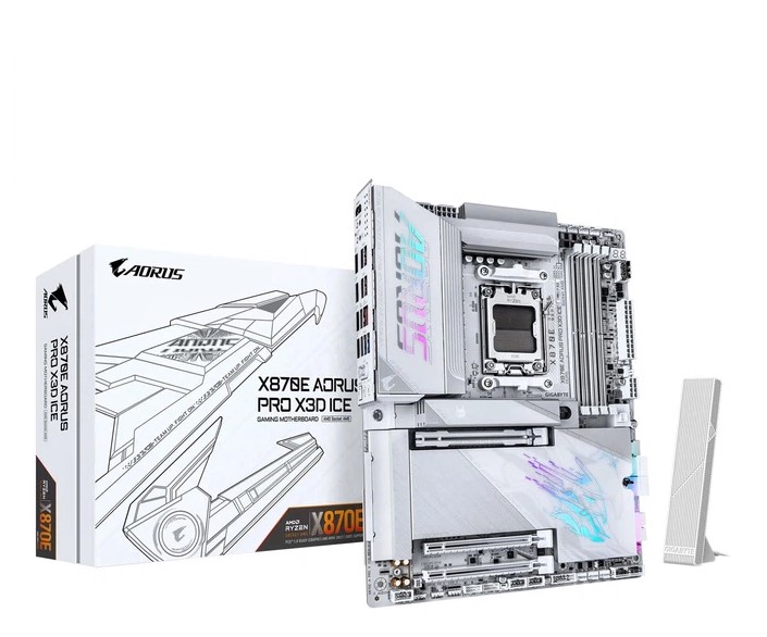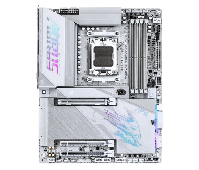 GigaByte X870E A PRO X ICE Материнская плата. Конструкция блока питания: 18+2+2; Поддерживаемые семейства процессоров: AMD RyZen™; Разъем процессора: разъем AM5; Поддерживаемый тип памяти: DDR5-5200 МГц; DDR5-4800 МГц; Количество слотов памяти: 4 x DIMM; Максимальный объем оперативной памяти: 256 ГБ; Архитектура памяти: Двухканальная.