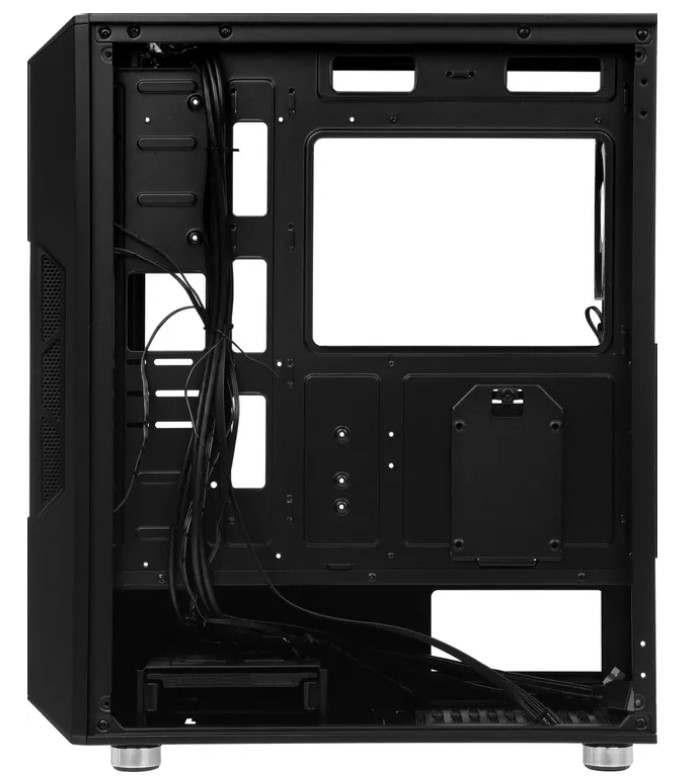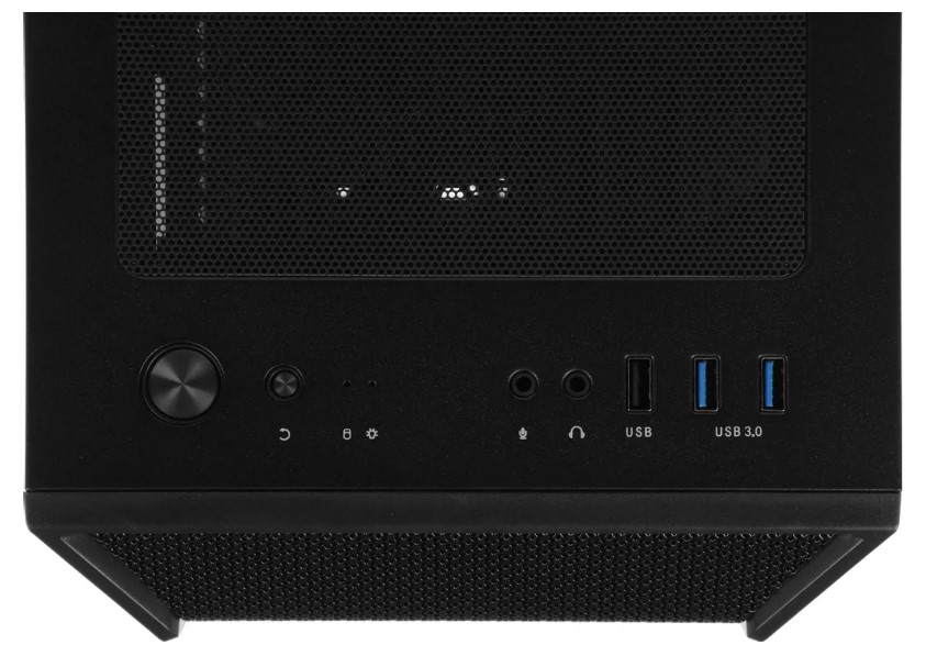 Конструкция продумана для удобства сборки и обслуживания: нижнее расположение блока питания помогает грамотно организовать кабель0менеджмент, а боковые панели с креплением на петлях облегчают доступ к внутренним элементам. На лицевой панели удобно расположены разъёмы — два USB 3.0, один USB 2.0, а также аудиоразъёмы для наушников и микрофона, плюс кнопки питания и перезагрузки.