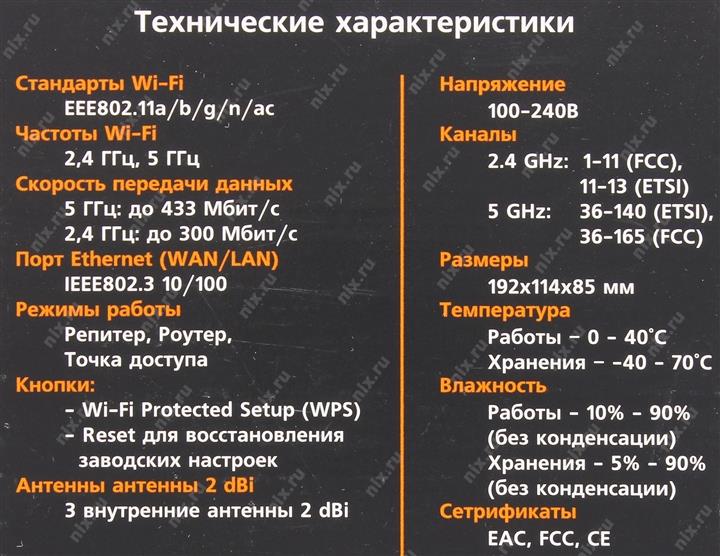 | Индикаторы | 2.4 ГГц, 5 ГГц, Power, Signal, WLAN |